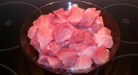 Na patelni rozgrzewamy trochę oleju. Wrzucamy połowę mięsa. Obsmażamy z każdej strony. Gdy lekko się zrumieni (trwa to kilka minut) przekładamy je do osobnego naczynia. Dolewamy na patelnię odrobinę oleju, żeby to, co na niej pozostało nie zaczęło się palić. Cały czas mamy największy gaz. Wrzucamy drugą połowę mięsa i postępujemy z nim tak, jak z poprzednią częścią. Mięso smażymy na raty, bo gdy wrzucimy na raz całość zamiast się dokładnie obsmażyć może puścić sok i zacząć się gotować, a ta czynność będzie później. Poza tym niedokładnie obsmażone mięso to zbyt jasny kolor sosu.