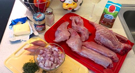 Wlewamy wino i dajemy mu odparować przez ok 3 minuty wciąż mieszając i zbierając z dna patelni pozostawiony przez królika smak. Dolewamy wodę i musztardę. Gdy całość się zagotuje układamy w sosie królika, mieszamy, przykrywamy i zmniejszamy gaz. Dusimy go ok. 40 minut co jakiś czas przewracając na druga stronę.