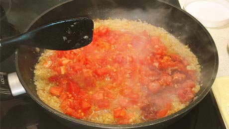 Rozgrzewamy patelnię z olejem kokosowym, wrzucamy cebulę i rumienimy. Dokładamy czosnek i imbir. Pomidora sparzamy i obieramy ze skórki przed pokrojeniem. Musi być bardzo mięsisty i dojrzały. Jeśli nie ma sezonu na pomidory używamy tych dostępnych i dodajemy 2 łyżeczki pasty pomidorowej lub używamy pomidorów z puszki. Przyprawiamy i smażymy ok 3 minuty. Dodajemy śmietanę.