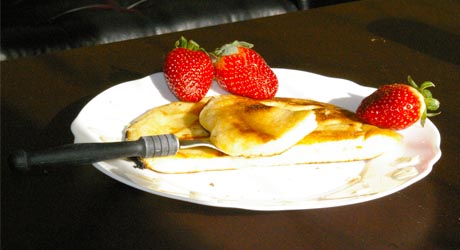 Szeroką, płaską łopatką delikatnie przekładamy omlet na drugą stronę. Jeśli trzeba wlewamy na patelnie kilka kropli oleju. Smażymy ok. 2 minuty, aż się zezłoci. Ostrożnie zsuwamy z patelni na duży talerz.