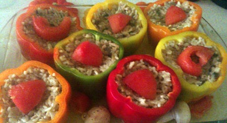 Papryki nadziewamy farszem, nakładamy „pokrywki” i układamy ciasno w żaroodpornym naczyniu wysmarowanym tłuszczem. Wrzucamy całe pieczarki, kawałki pomidora, którego wcześniej sparzamy i obieramy ze skórki oraz posiekamy na plasterki czosnek. Całość zalewamy bulionem.