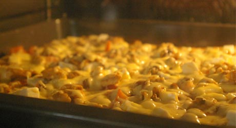 Pierś z kurczaka kroimy w kostkę lub paseczki, przyprawiamy i podsmażamy na niewielkiej ilości tłuszczu. Dorzucamy pokrojone w ćwiartki pieczarki i chwilę dusimy. Fetę kroimy w kostkę, ser żółty ścieramy na tarce o dużych oczkach.