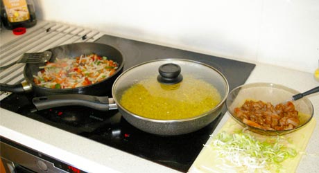 Na patelni rozgrzewamy olej i wrzucamy warzywa, solimy. Smażymy na największym ogniu nie dłużej niż 5 minut. Mają się tylko rozmrozić i odparować - muszą pozostać twardawe w środku, prawie surowe. Gdy są już gotowe dorzucamy je do smażonego ryżu.