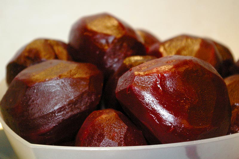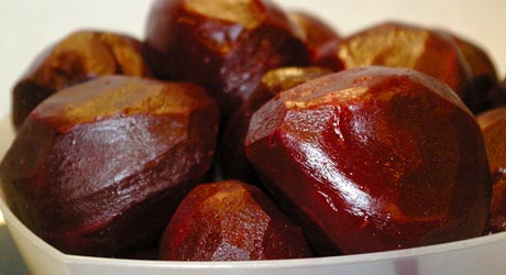 Buraki układamy w dużym garnku i zalewamy wodą tak, żeby były przykryte. Gotujemy na małym ogniu pod przykryciem godzinę od zagotowania.