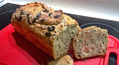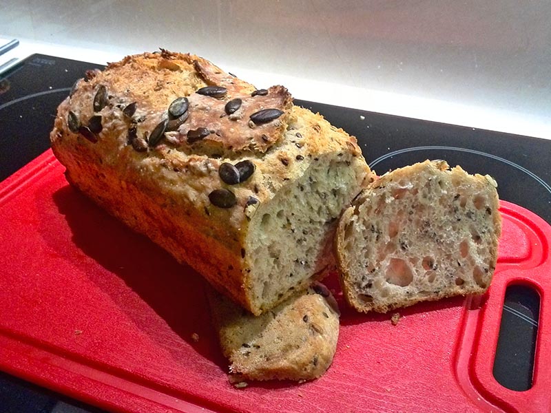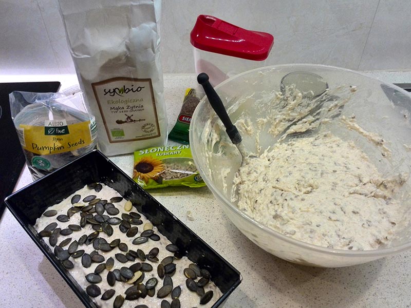 Na tą ilość ciasta używam dwóch foremek wielkości 25,5 x 12 cm. Smarujemy je olejem. Umyte od ciasta ręce moczymy zimną woda i nakładamy ciasto do foremek - dzięki zmoczeniu rąk ciasto drożdżowe łatwo się odklei. Ciasta powinno być trochę ponad połowę foremki. Ciasto chlebowe w foremkach zwilżamy wodą i posypujemy pestkami dyni. Odstawiamy foremki w ciepłe miejsce na ok. 15 minut do wyrośnięcia.