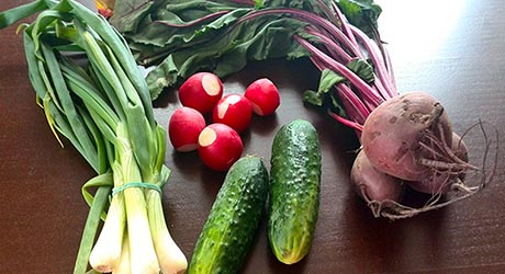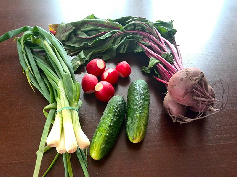 Ogórki obieramy i razem z rzodkiewkami ścieramy na tarce o dużych oczkach, dokładamy do kefirowej mieszanki.