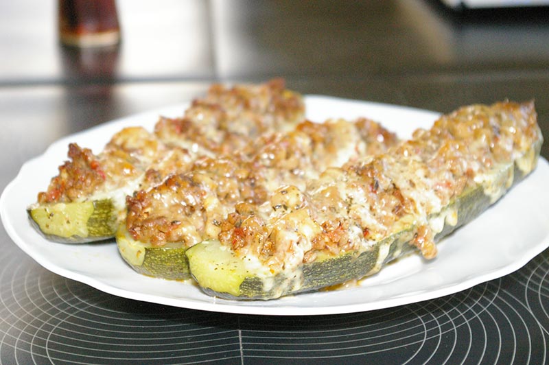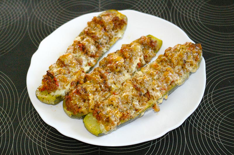Z podanych składników farszu wystarczyłoby na ok. podwójną porcję, można więc użyć 4-6 cukinii i zrobić porcję dla większego lub głodniejszego grona.