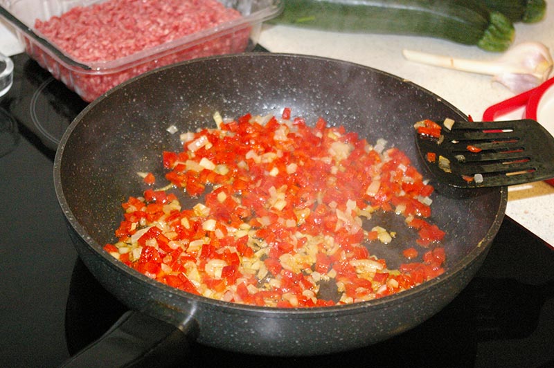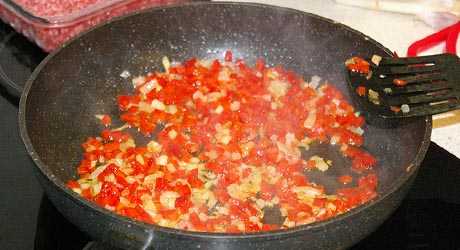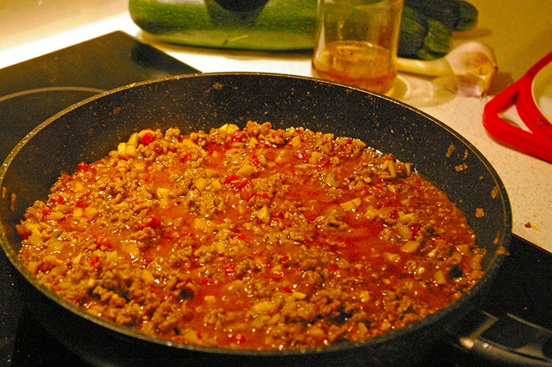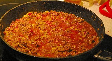 Rozgrzewamy na patelni olej i podsmażamy cebulę. Gdy się zeszkli wrzucamy czosnek i pieczarki a po 2 minutach mięso, przyprawiamy. Smażymy kilka minut na dużym ogniu cały czas mieszając i rozdrabniając mięso. Dokładamy paprykę, pomidora oraz keczup i smażymy ok. 3 minut.