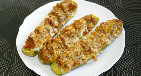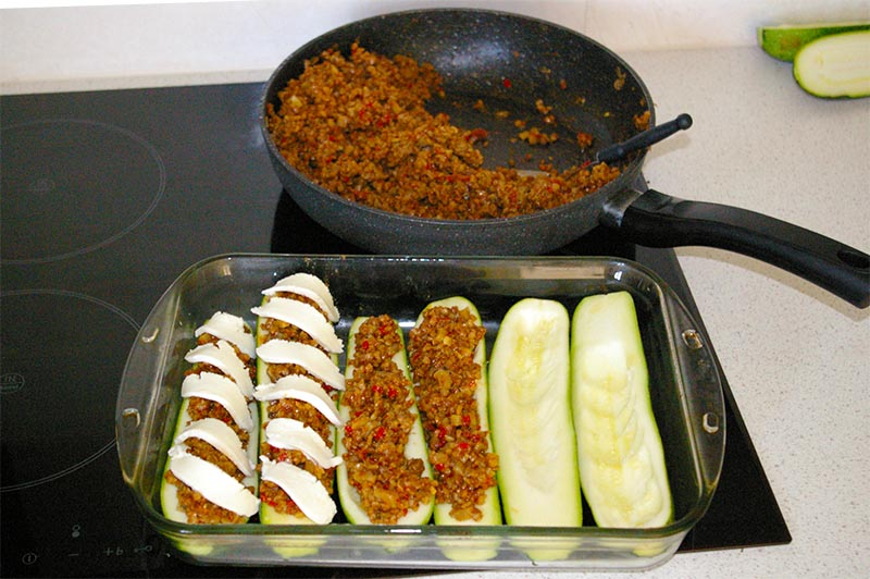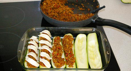 Cukinie myjemy, obcinamy niejadalne końcówki, nie obieramy. Kroimy wzdłuż na pół, wydrążamy małą łyżeczką środki (miękką część, przy większych cukiniach z pestkami). Każdą połówkę nacieramy solą i czosnkiem granulowanym i układamy w żaroodpornym naczyniu wysmarowanym tłuszczem skórką do dołu. Każdą "łódeczkę" wypełniamy farszem, przykrywamy paseczkami mozzarelli i posypujemy bazylią, przykrywamy pokrywką lub folią aluminiową i wstawiamy po piekarnika. Pieczemy ok. 40 minut.