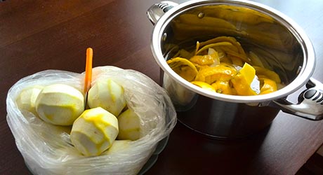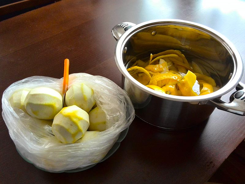Cytryny bardzo dokładnie myjemy gąbeczką (taką jak do naczyń) i gorącą wodą. Jest to bardzo ważne, ponieważ sklepowe cytryny pokrywane są specjalnym woskiem, który musimy zmyć. Obieramy je bardzo cienko, tylko żółtą skórkę. Możemy do tego użyć obieraczki do warzyw. Skórki wrzucamy do garnka i zalewamy spirytusem, przykrywamy i odstawiamy w ciemne miejsce na dobę.