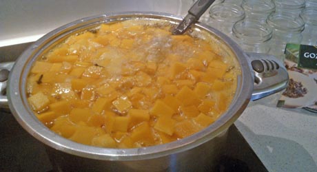 Jeżeli za pierwszym razem nie zmieściliśmy w garnku całej dyni wrzucamy ją do pozostałej zalewy, zagotowujemy i powtarzamy dalsze kroki.