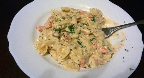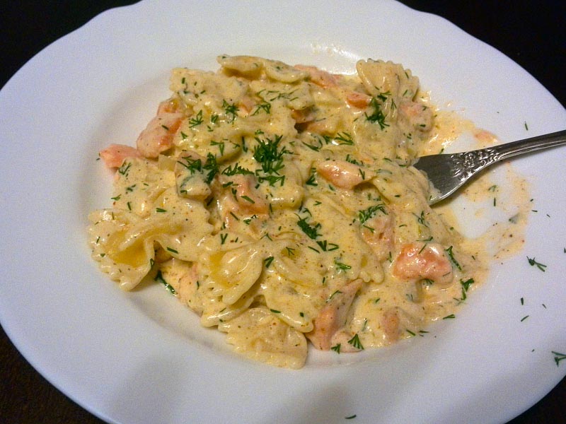 Przesmażamy przez ok. 2 minuty, dokładamy łososia, który ma się tylko lekko ściąć, wystarczą 2 minuty. Na patelnię dosypujemy mąkę i pieprz ziołowy. Przesmażona mąka lekko zagęści sos a podgrzany pieprz będzie bardziej aromatyczny. Po małej chwili wlewamy śmietankę, gdy się zagotuje dodajemy posiekany koperek i ugotowany makaron. Potrawy nie trzeba już solić, ponieważ wędzony łosoś jest przeważnie dość słony. Gdy całość się zagotuje możemy podawać.
