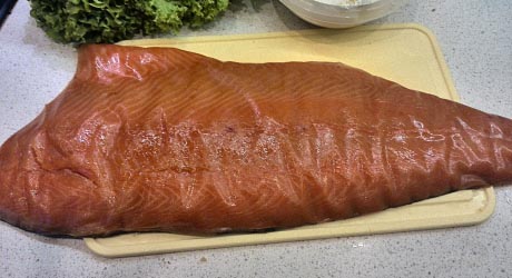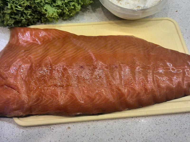 Łososia kroimy na niezbyt długie paski. Sposób pokrojenia nie ma większego znaczenia, bo na patelni i tak trochę się rozpadnie.