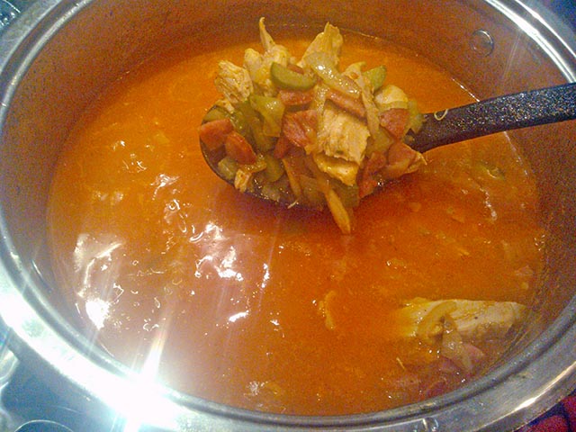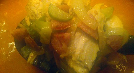 Wyrzucamy skórki, mięso oddzielamy od kości i kroimy na mniejsze kawałki. Dokładamy do gotującej się reszty potrawy. Dokładamy też musztardę, koncentrat i ewentualnie sól do smaku. Gotujemy aż ogórki zmiękną a płyn trochę odparuje.