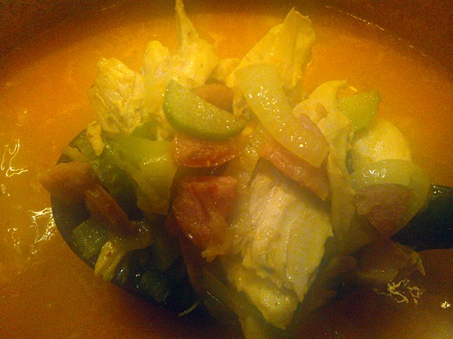 Cebulkę kroimy w ćwierćplasterki i podsmażamy, wrzucamy do bulionu. Nastawiamy na średni ogień. Kiełbasę kroimy w półplasterki, też podsmażamy i wrzucamy do bulionu.