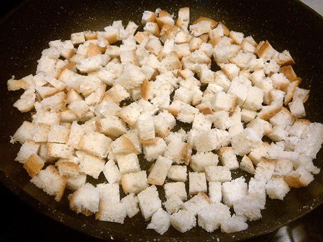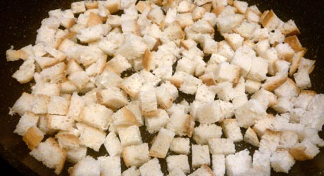 Chleb lub bułki kroimy w kostkę. Na patelni rozgrzewamy łyżkę oleju. Wrzucamy pokrojone pieczywo i zmniejszamy ogień. Posypujemy przyprawami. Grzanki na patelni powinny się suszyć. Musimy je ciągle mieszać. Są gotowe po kilku minutach kiedy staną się chrupiące.