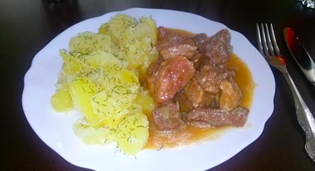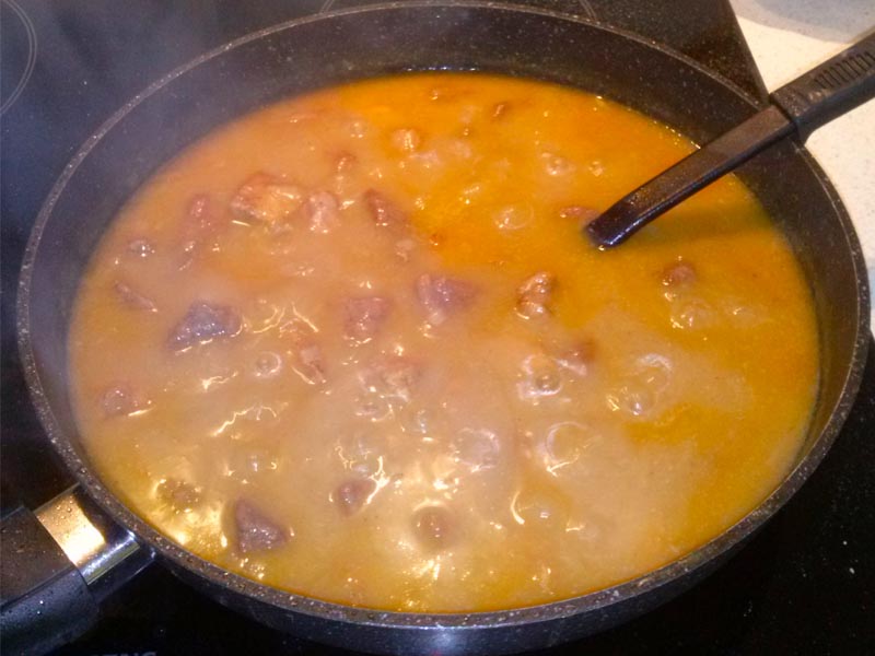 Po tym czasie mięso jest już miękkie. Odkrywamy patelnię, wyrzucamy liście laurowe, zwiększamy gaz i pozwalamy odparować nadmiarowi wody. Musimy pamiętać o częstym mieszaniu, gdyż sos gęstniejąc będzie bardziej przywierał. Gdy sos będzie już wystarczająco gęsty smakujemy i ewentualnie dosalamy.