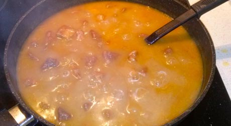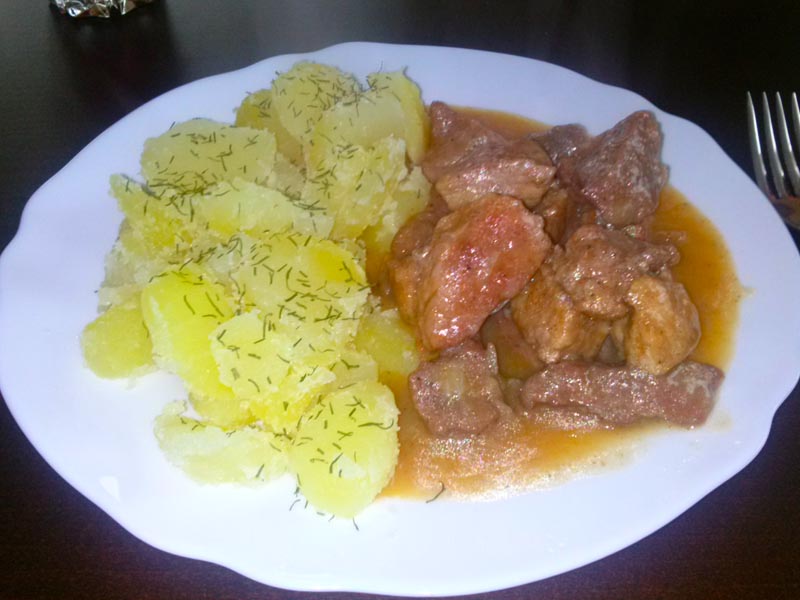 Do cebuli wrzucamy całe mięso, smażymy chwilę mieszając. Wrzucamy liście laurowe. Zalewamy wrzącą wodą, tak żeby patelnia była prawie pełna. Przykrywamy, zmniejszamy gaz do połowy. Dusimy przez półtorej godziny do jakiś czas mieszając i uzupełniając wodę (nie musi już być zagotowana, może być tak po prostu z kranu).