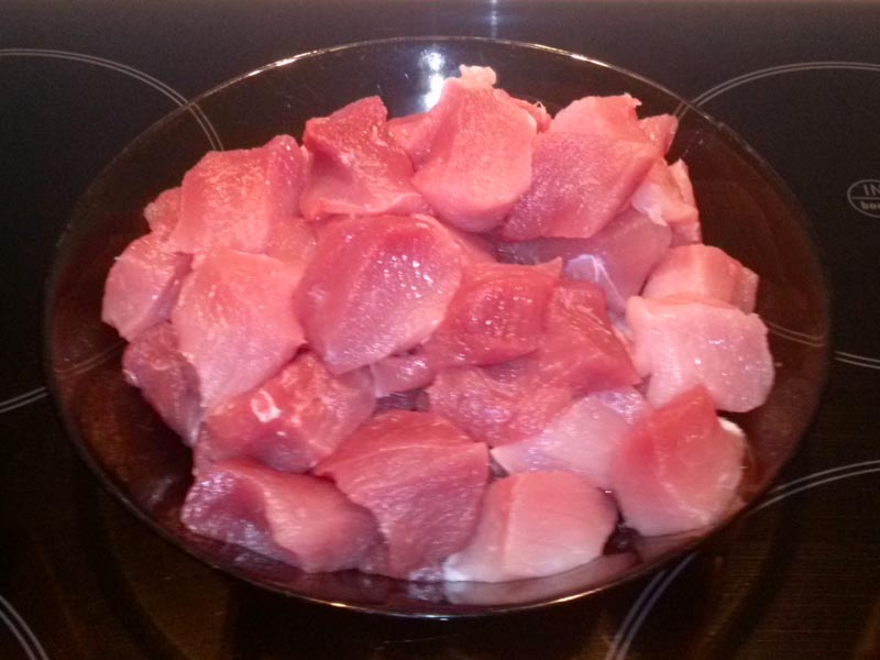 Na patelni rozgrzewamy trochę oleju. Wrzucamy połowę mięsa. Obsmażamy z każdej strony. Gdy lekko się zrumieni (trwa to kilka minut) przekładamy je do osobnego naczynia. Dolewamy na patelnię odrobinę oleju, żeby to, co na niej pozostało nie zaczęło się palić. Cały czas mamy największy gaz. Wrzucamy drugą połowę mięsa i postępujemy z nim tak, jak z poprzednią częścią. Mięso smażymy na raty, bo gdy wrzucimy na raz całość zamiast się dokładnie obsmażyć może puścić sok i zacząć się gotować, a ta czynność będzie później. Poza tym niedokładnie obsmażone mięso to zbyt jasny kolor sosu.