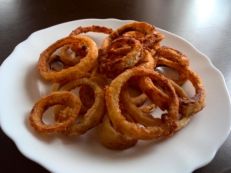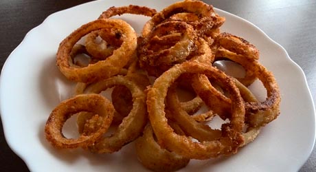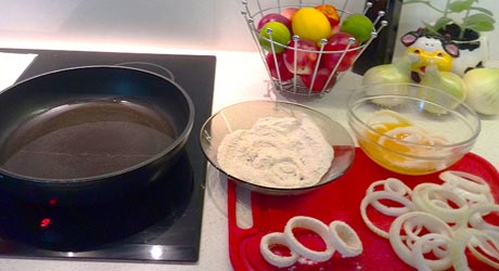 Krążki cebulowe pojedynczo wyciągamy z masy jajecznej i otaczamy dokładnie mieszance mączno-bułkowej.