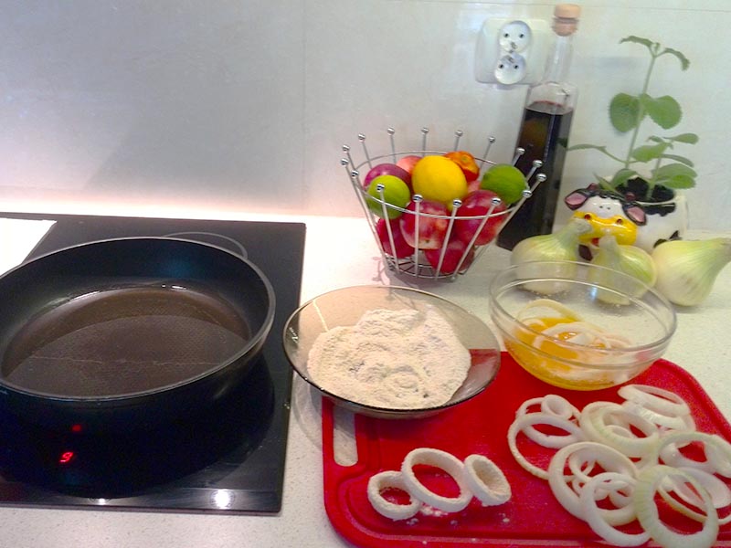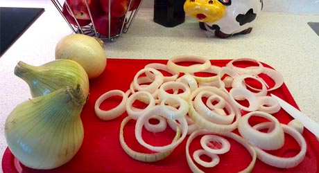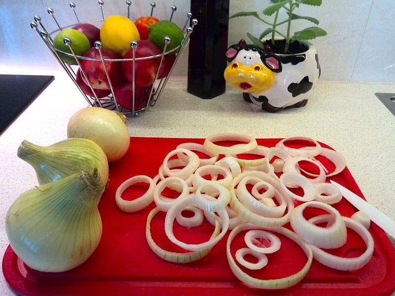 Cebule obieramy, odkrawamy korzeń i kroimy na plastry grubości ok 5 mm. Dzielimy na krążki.