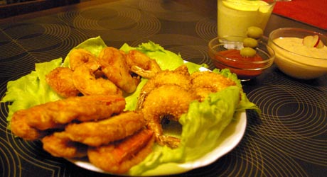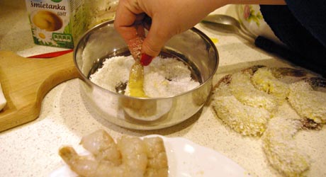 Każdą krewetkę maczamy w cieście trzymając za ogonek i obtaczamy we wiórkach kokosowych. Krótko smażymy na złoty kolor.