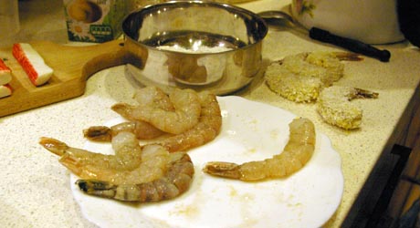 Krewetki myjemy, obieramy (zostawiamy ogonki, usuwamy jelito), solimy, posypujemy czosnkiem i odstawiamy na kilka minut.