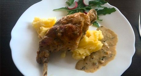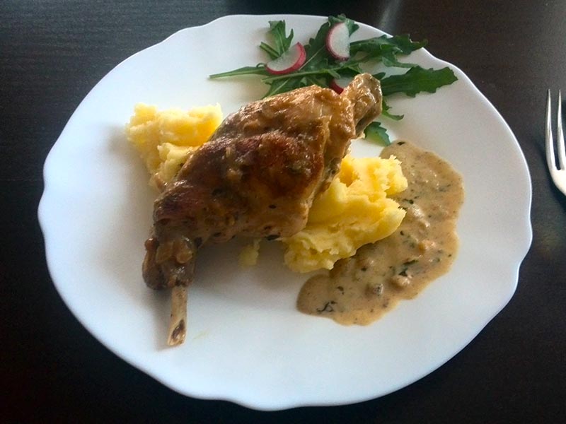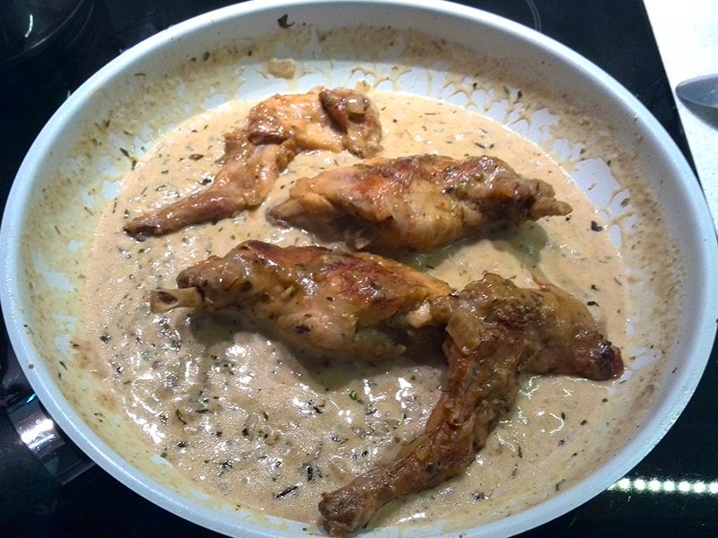 Po uduszeniu mięsa wyciągamy je, do sosu wlewamy śmietankę i zagotowujemy. Układamy w sosie królika, polewamy nim i pozwalamy mu się chwilę połączyć i nabrać smaku sosu.