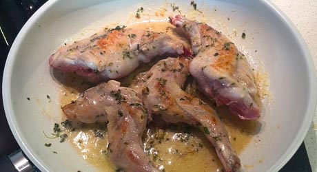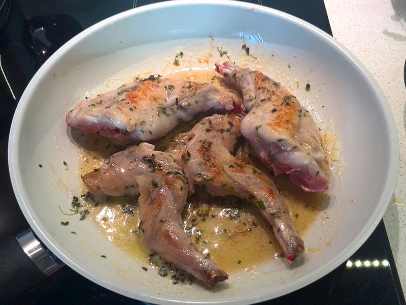 Skoki z królika nacieramy solą i siekanym tymiankiem i odstawiamy na godzinę (może być na dłużej).