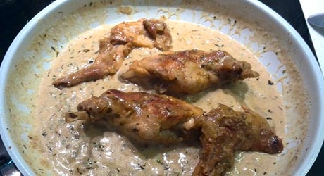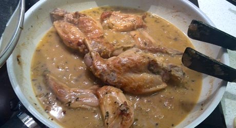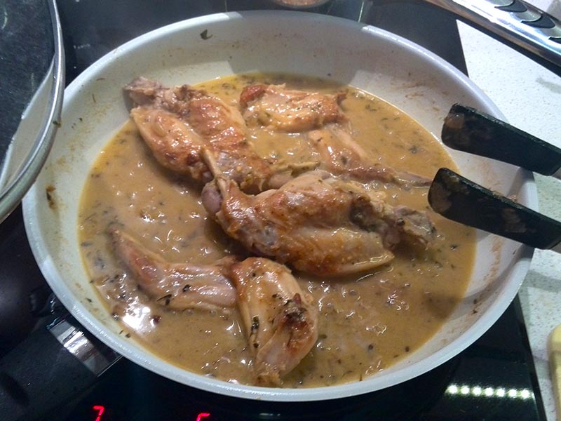 Wlewamy wino i dajemy mu odparować przez ok 3 minuty wciąż mieszając i zbierając z dna patelni pozostawiony przez królika smak. Dolewamy wodę i musztardę. Gdy całość się zagotuje układamy w sosie królika, mieszamy, przykrywamy i zmniejszamy gaz. Dusimy go ok. 40 minut co jakiś czas przewracając na druga stronę.