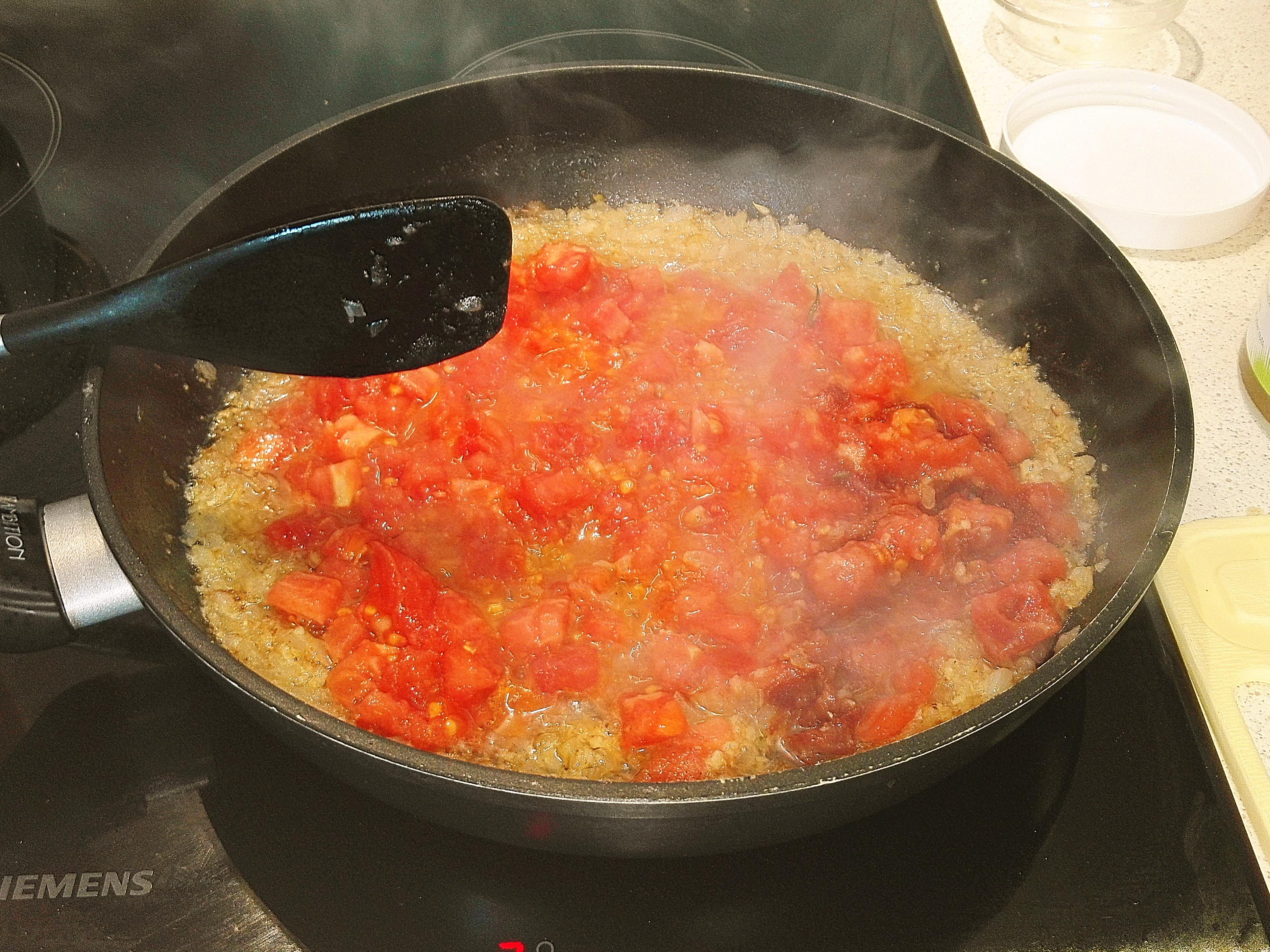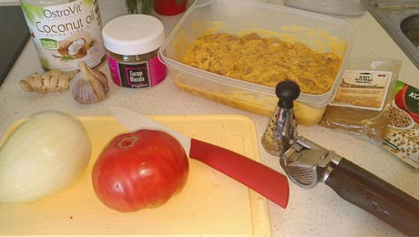 Rozgrzewamy patelnię z olejem kokosowym, wrzucamy cebulę i rumienimy. Dokładamy czosnek i imbir. Pomidora sparzamy i obieramy ze skórki przed pokrojeniem. Musi być bardzo mięsisty i dojrzały. Jeśli nie ma sezonu na pomidory używamy tych dostępnych i dodajemy 2 łyżeczki pasty pomidorowej lub używamy pomidorów z puszki. Przyprawiamy i smażymy ok 3 minuty. Dodajemy śmietanę.