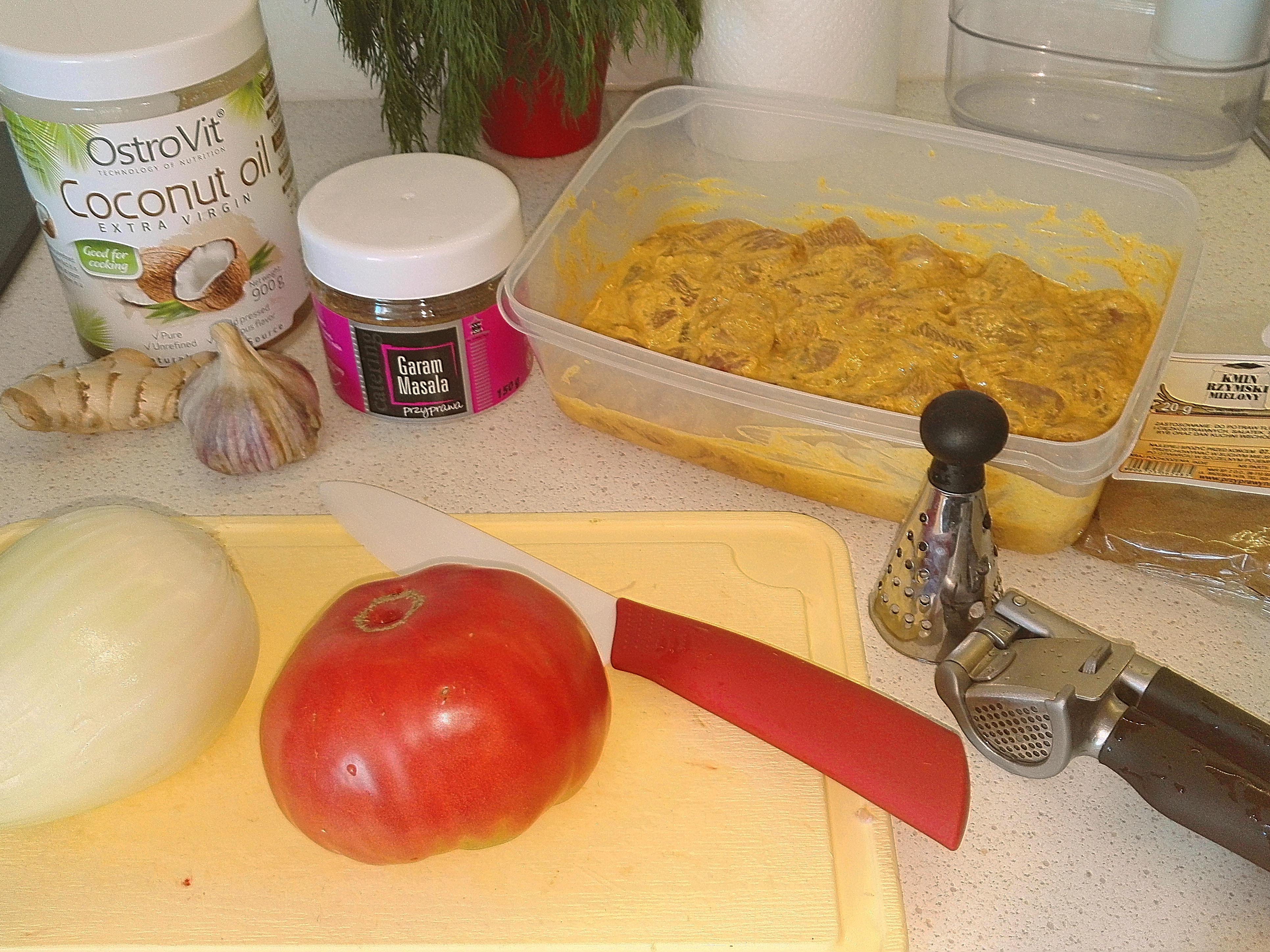 Kurczaka kroimy w kostkę ok. 3x3 cm. Olej kokosowy będzie do smażenia. Wszystkie składniki marynaty mieszamy. Wrzucamy kurczaka do marynaty, mieszamy dokładnie i odstawiamy na pół godziny poza lodówką. Można go też marynować nawet do następnego dnia, ale już w lodówce.