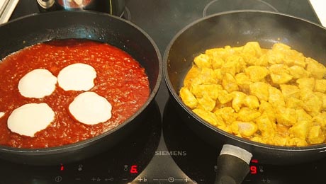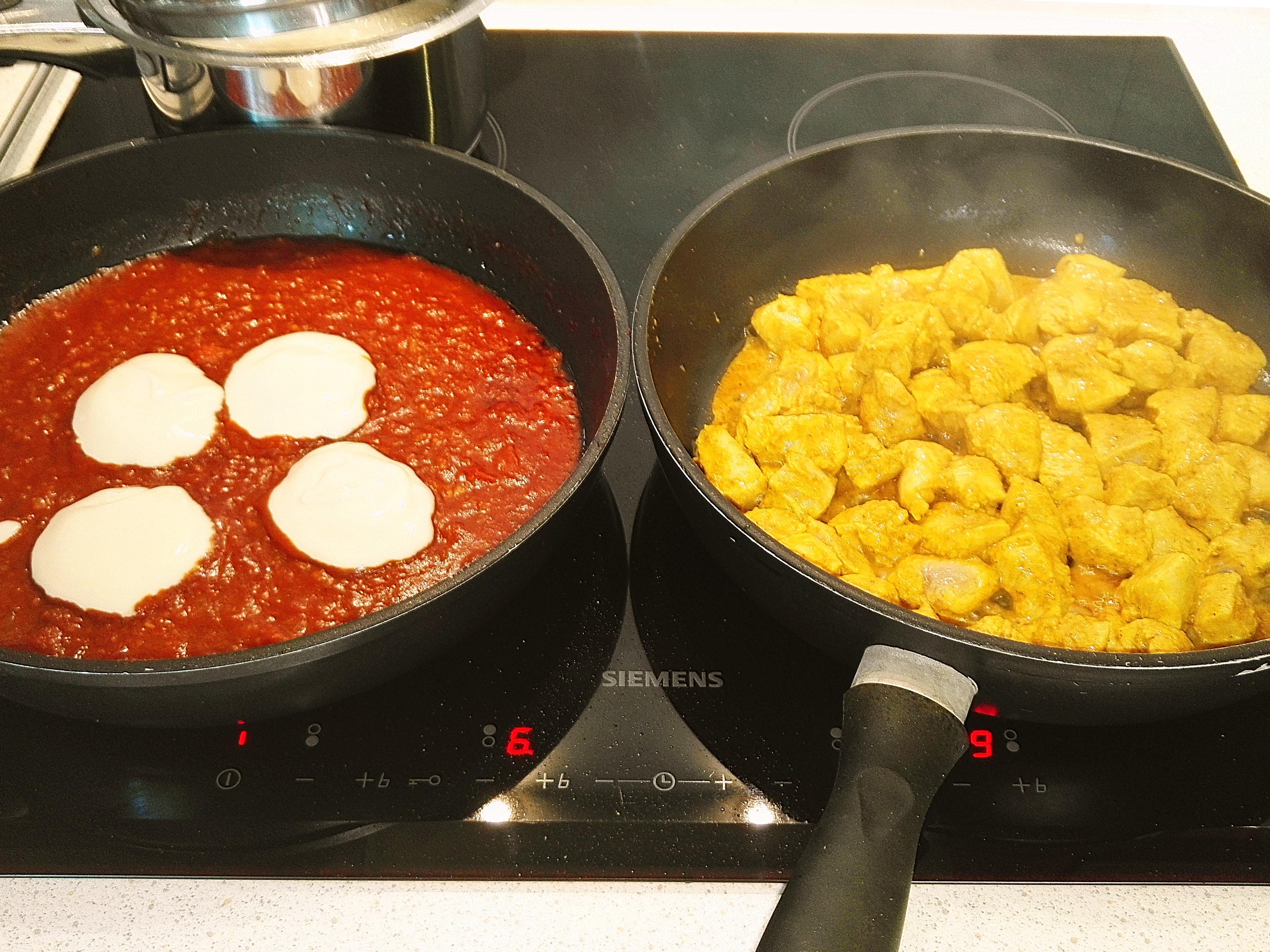 Zamarynowanego kurczaka smażymy na oleju kokosowym ok. 6 minut na największym ogniu. Rozgrzewamy sos Masala, do sosu dorzucamy kurczaka i dusimy pod przykryciem ok. 3 minuty.