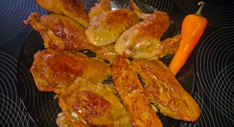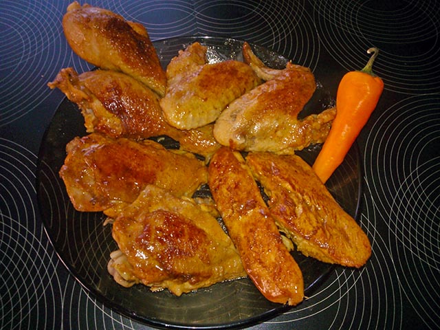 Rozgrzewamy patelnię z odrobiną oleju. Wrzucamy kurczaka i obsmażamy ze wszystkich stron na dość dużym ogniu. Kiedy się zrumieni wlewamy na patelnię trochę wody - tak, żeby kawałki mięsa zanurzone były do 1/3 i przykrywamy. Kiedy woda się zagotuje zmniejszamy ogień i dusimy 10 minut, potem przewracamy mięso na druga stronę i dusimy kolejne 10 minut. Po tym czasie odkrywamy pokrywkę, zwiększamy ogień i smażymy, aż prawie cały płyn odparuje często obracając mięso, aby dokładnie pokryło się sosem.