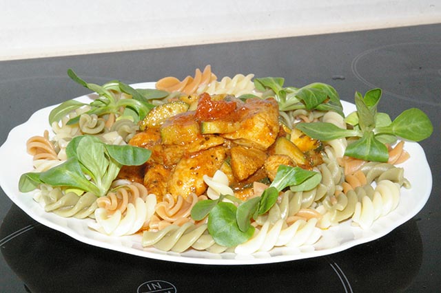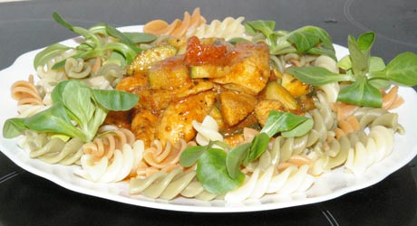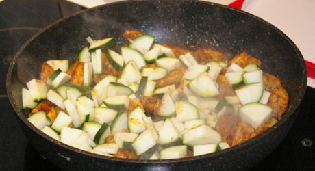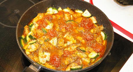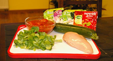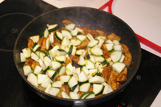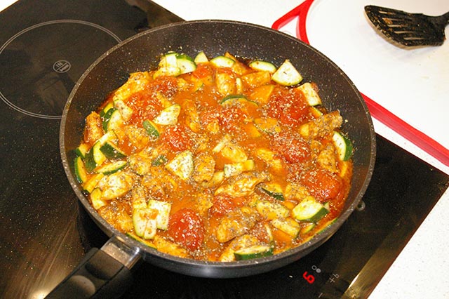 Na patelnię wlewamy odrobinę oleju, rozgrzewamy i wrzucamy mięso. Smażymy mieszając ok 3 minut. Dorzucamy cukinię i smażymy ok. 2 minut. Dokładamy pomidory wraz z zalewą. Smażymy mieszając ok. 7 minut. Kurczak nie może się wysuszyć, cukinia powinna pozostać chrupiąca a sos lekko się zredukuje. Jeżeli trzeba dosalamy.