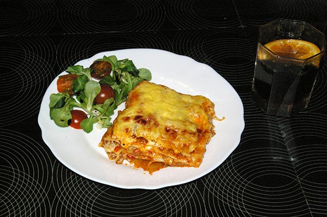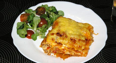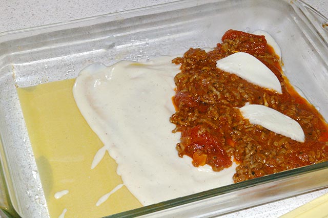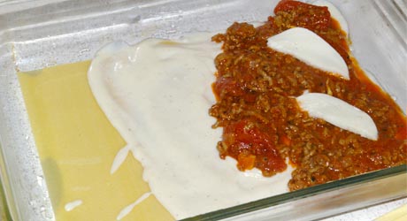 Do wysmarowanego tłuszczem naczynia wkładamy pierwszą warstwę makaronu (3 płaty), smarujemy dokładnie sosem beszamelowym (ok. 1/2 szkl.), wykładamy farsz i 1/4 mozzarelli pokrojonej w kostkę lub plasterki. Czynność powtarzamy czterokrotnie. Ostatnią warstwę makaronu smarujemy beszamelem, polewamy keczupem i posypujemy startym żółtym serem.