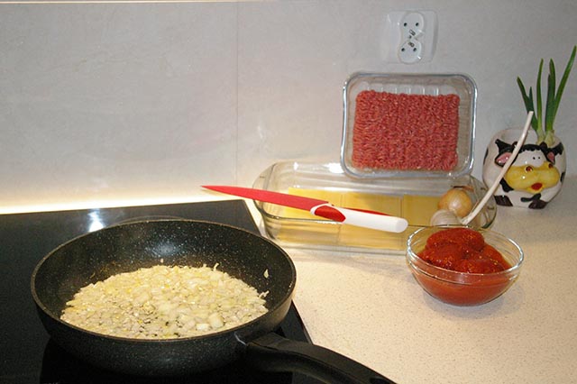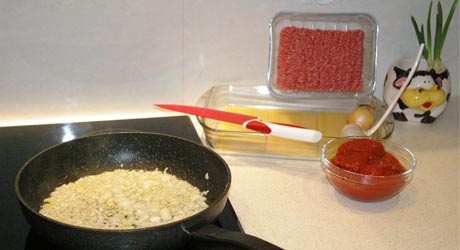 Cebulę i czosnek kroimy w kostkę i szklimy na patelni z odrobiną oleju. Wrzucamy mięso i obficie posypujemy przyprawami. Chwilę przesmażamy. Wrzucamy pomidory z zalewą (jeżeli używamy całych pomidorów musimy najpierw usunąć z nich szypułki a na patelni podzielić na mniejsze kawałki)i koncentrat pomidorowy. Smażymy bez pokrywki 10-15 minut - aż sos odparuje. Smakujemy - musi być intensywne.