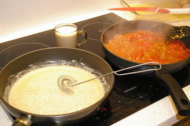 Na patelni lub w rondelku rozpuszczamy masło, wrzucamy mąkę, solimy i dodajemy gałkę muszkatołową. Podsmażamy ok minutę. Wlewamy mleko (jeżeli będzie ciepłe nie będą się robiły grudki) i ciągle mieszamy ok. minutę.