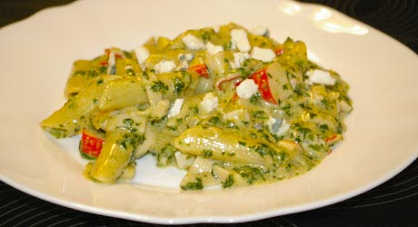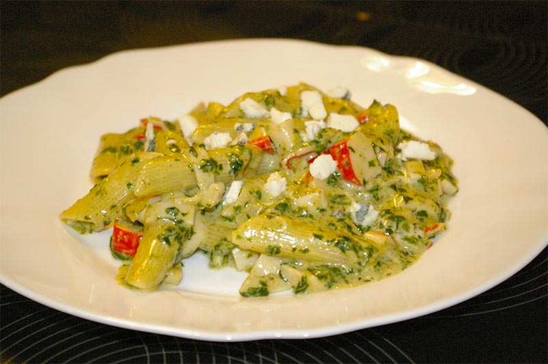 Ser z niebieską pleśnią (nie musi to być Lazur, ale to mój ulubiony) kroimy w drobną kostkę lub kruszymy. 3/4 sera wrzucamy na patelnię. Całość przesmażamy przez minutę.