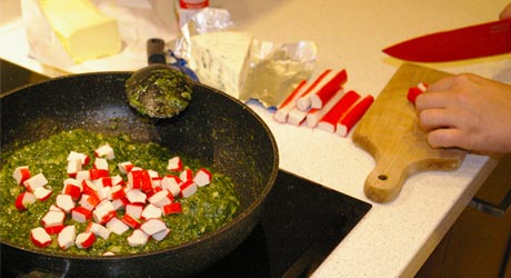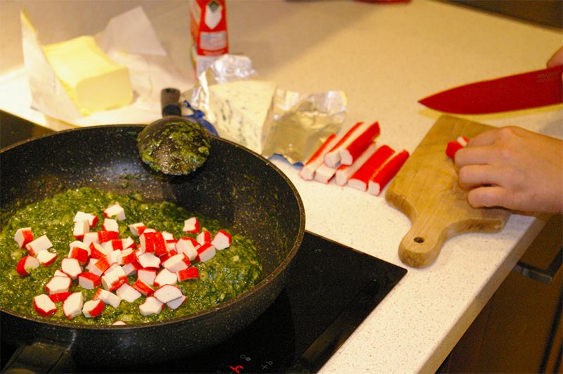 Paluszki surimi (jeśli kupiliśmy mrożone należy uprzednio je rozmrozić) kroimy na kawałki po ok 5 mm. Dokładamy do reszty, wlewamy śmietankę i mieszamy.