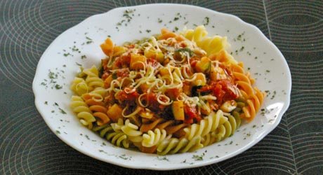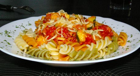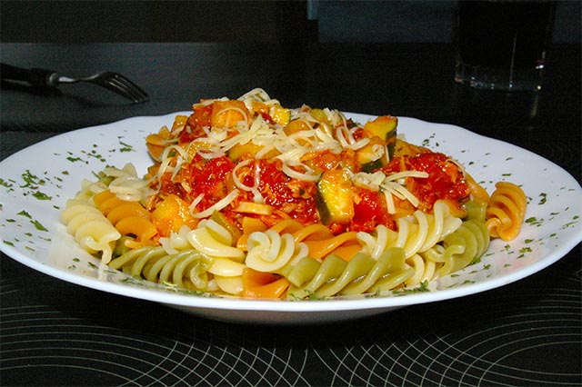 Całość rozkładamy na makaronie na talerzach i posypujemy parmezanem.
