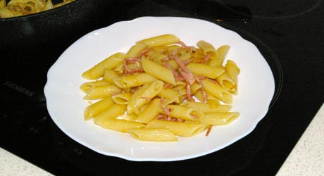 Na patelni rozgrzewamy masło i olej, wrzucamy cebulę i szynkę. Przesmażamy nie dłużej niż minutę. Cebulką ma się lekko zeszklić a szynka puścić aromat. Dokładamy makaron i przesmażamy mieszając ok. 3 minuty.