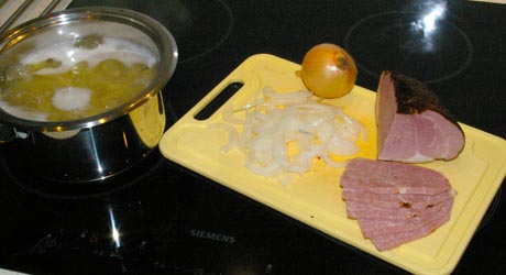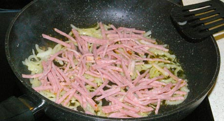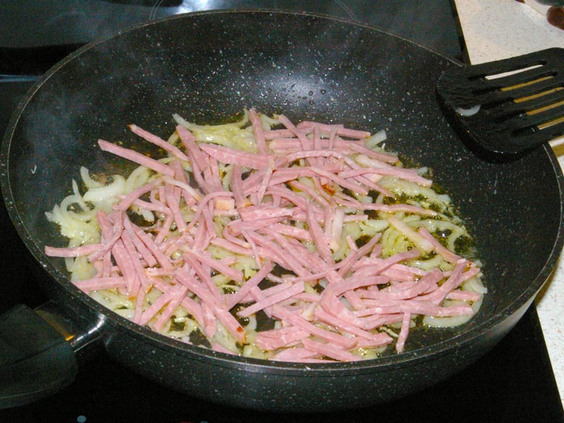 Cebulkę kroimy w piórka, szynkę w paseczki.