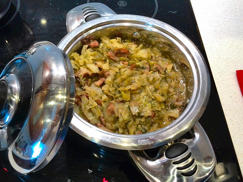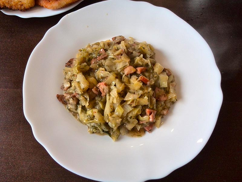 Na patelnię wrzucamy kapustę i chwilę przesmażamy, żeby nabrała temperatury po czym przekładamy do garnka i mieszamy z kiełbasą i cebulą. Na patelnię wlewamy wodę i zagotowujemy, przelewamy do garnka. Całość posypujemy koperkiem, pieprzami i cukrem, solimy. Zmniejszamy ogień, przykrywamy i dusimy ok. 15 minut co jakiś czas mieszając.