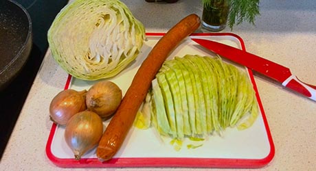 Kiełbasę kroimy na ćwierćplasterki, cebulkę w kostkę. Kapustę szatkujemy a koperek drobno siekamy.