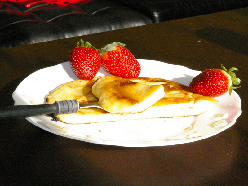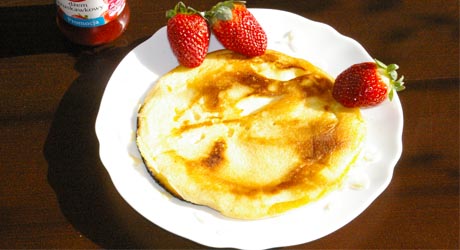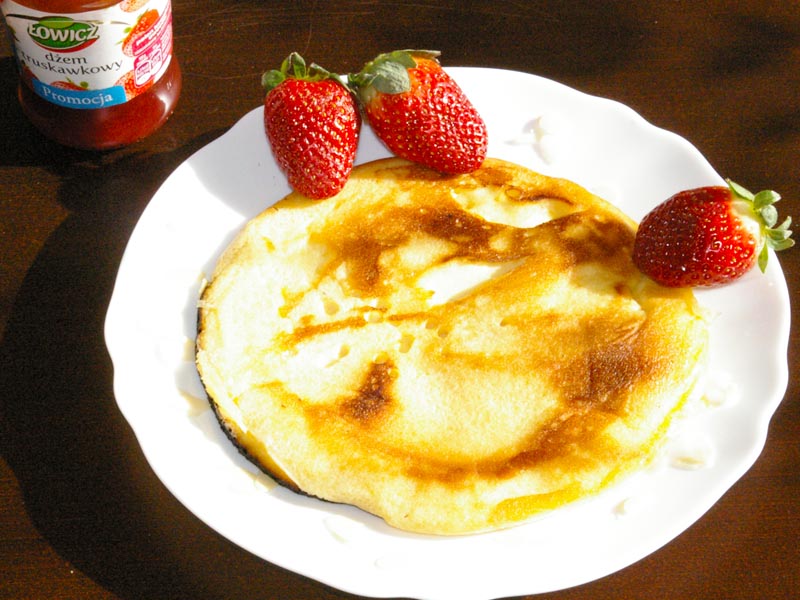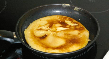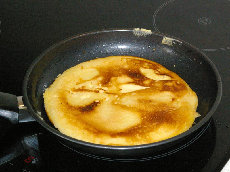 Szeroką, płaską łopatką delikatnie przekładamy omlet na drugą stronę. Jeśli trzeba wlewamy na patelnie kilka kropli oleju. Smażymy ok. 2 minuty, aż się zezłoci. Ostrożnie zsuwamy z patelni na duży talerz.
