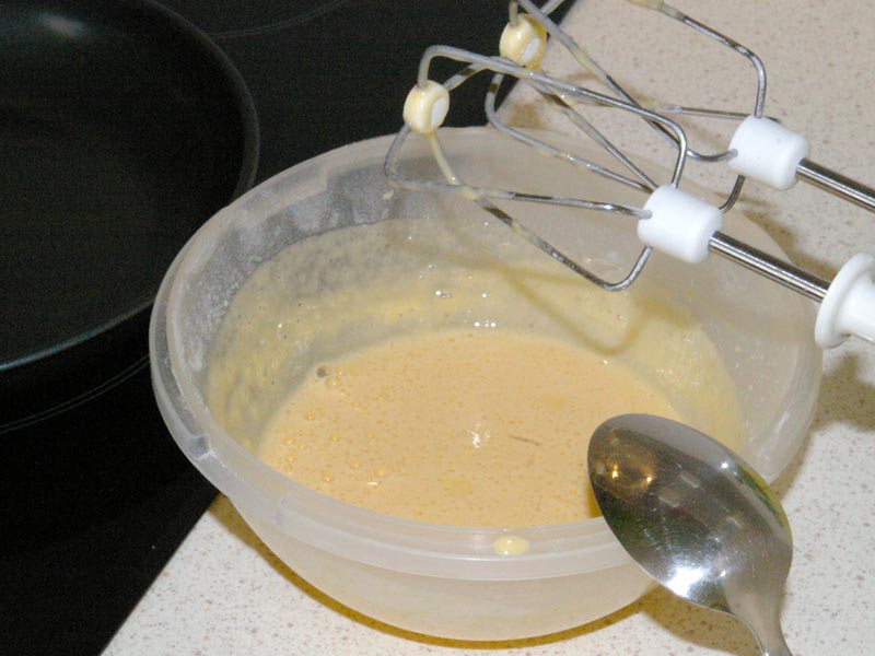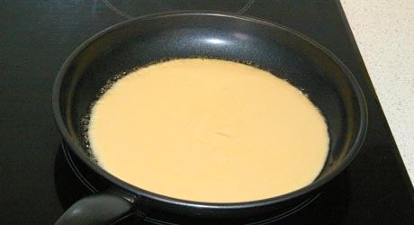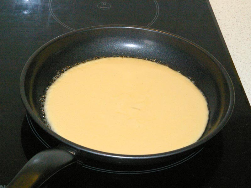 Masło i olej rozgrzewamy na patelni. Wlewamy całe ciasto. Zmniejszamy gaz. Nie dotykamy patelni, żeby omlet nie opadł. Zaczną się nim robić pęcherzyki i będzie pięknie rósł. Trzymamy go tak ok. 3 minuty. Pod koniec tego czasu możemy delikatnie podglądnąć czy jest już dobrze zezłocony.