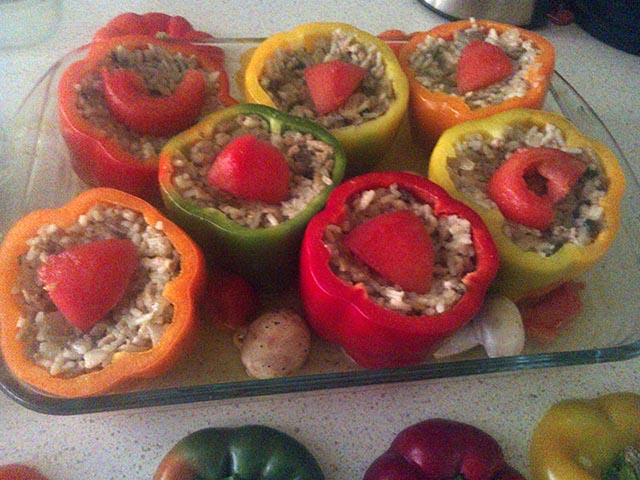 Nagrzewamy piekarnik do 180 st. góra/dół. Wstawiamy papryki. Po pół godzinie przykrywamy (może być folią aluminiową) i dusimy kolejne pół godziny.