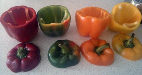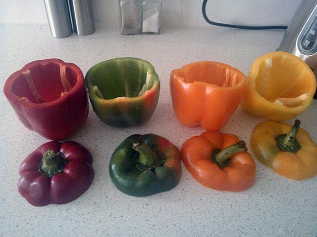 Z papryk odcinamy „pokrywki”, wydrążamy środki i myjemy.