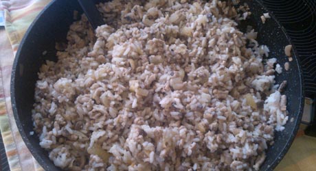 Na patelnie wlewamy olej i wrzucamy mięso, posypujemy solą, pieprzem i paprykami, smażymy ok 5 minut. Do mięsa dorzucamy surowy ryż, wlewamy 1 1/2 szkl. wody, mieszamy i przykrywamy. Trzymamy na małym gazie przez 15 minut, po tym czasie dorzucamy do cebuli i pieczarek.